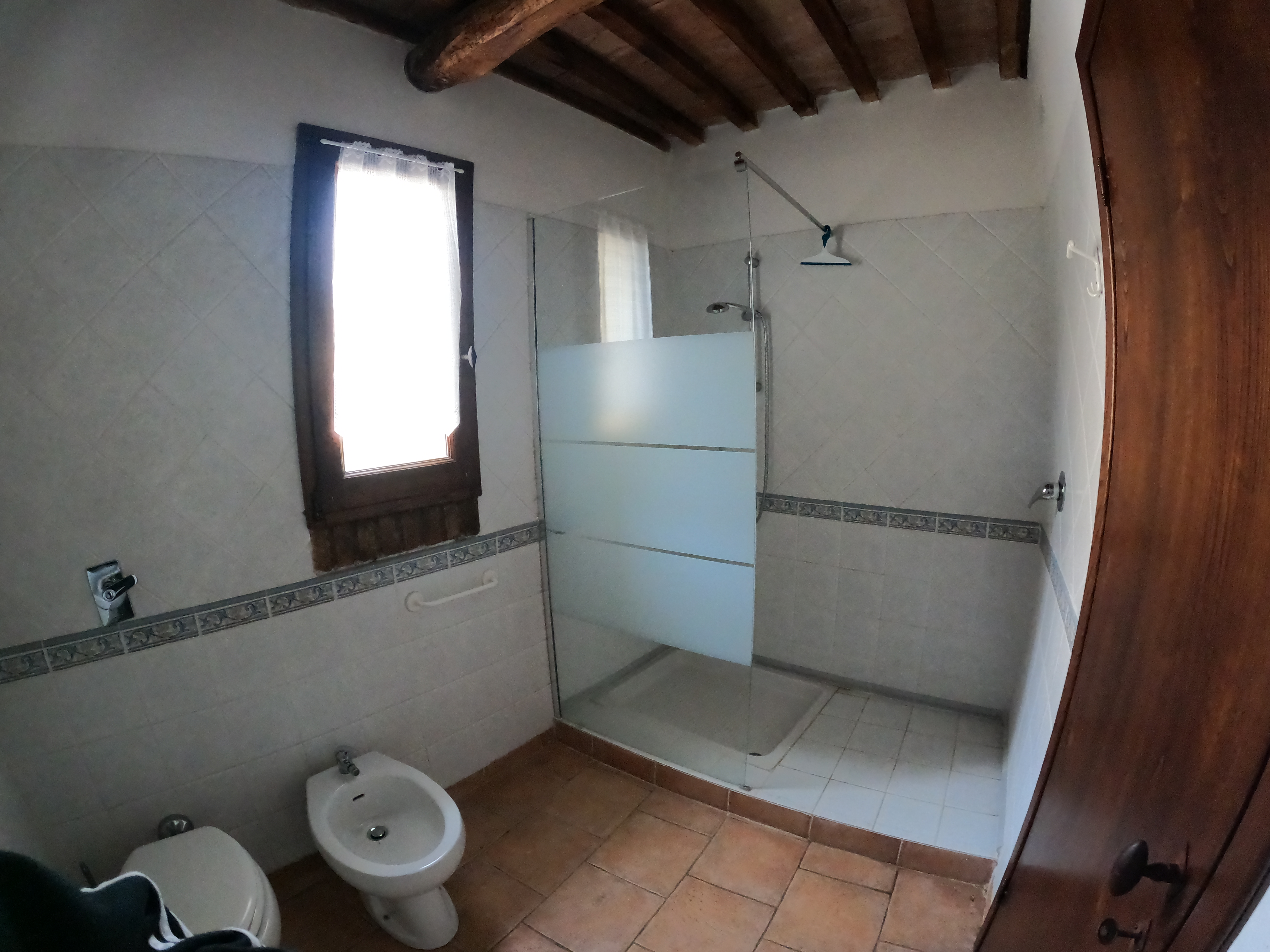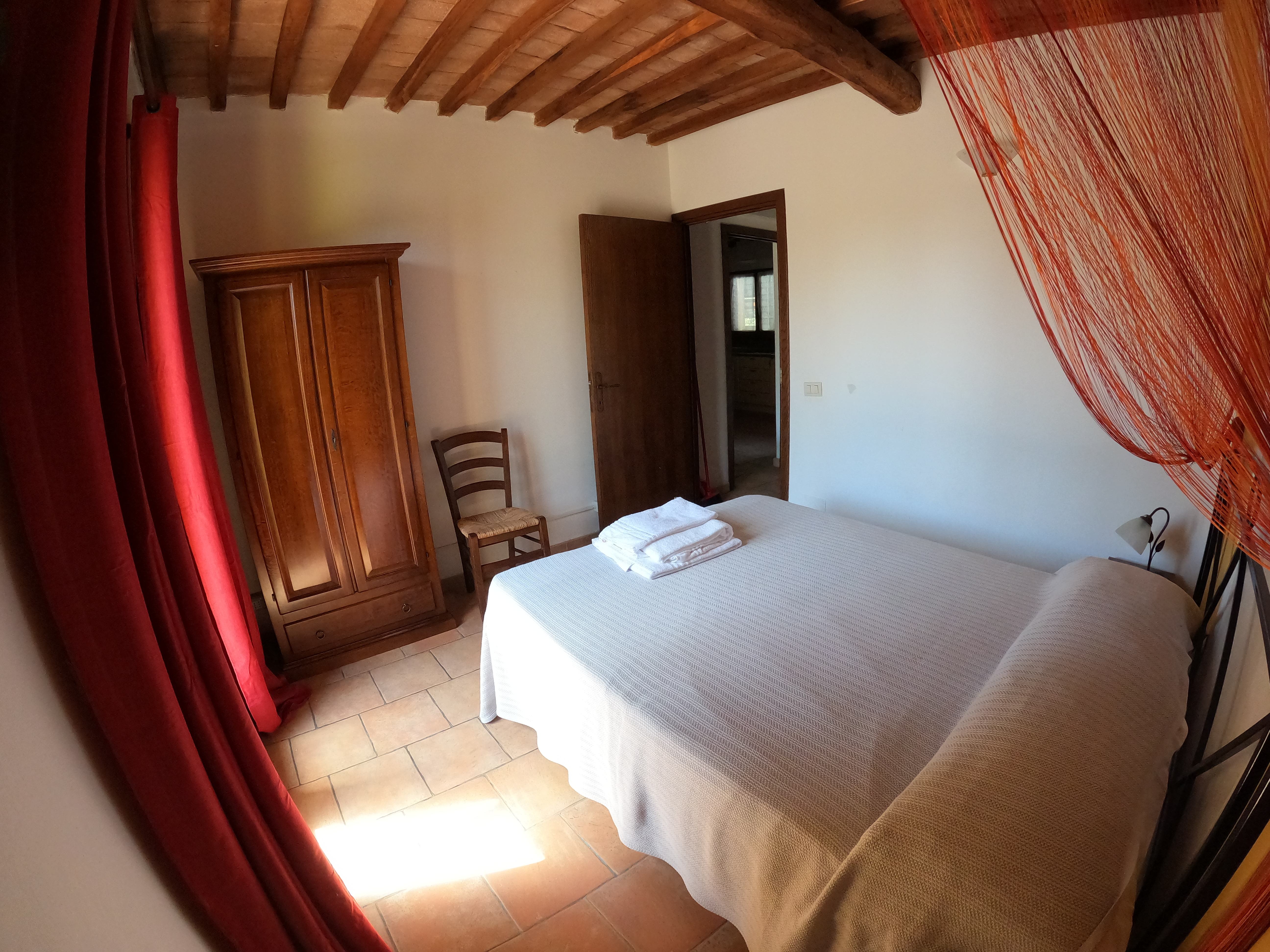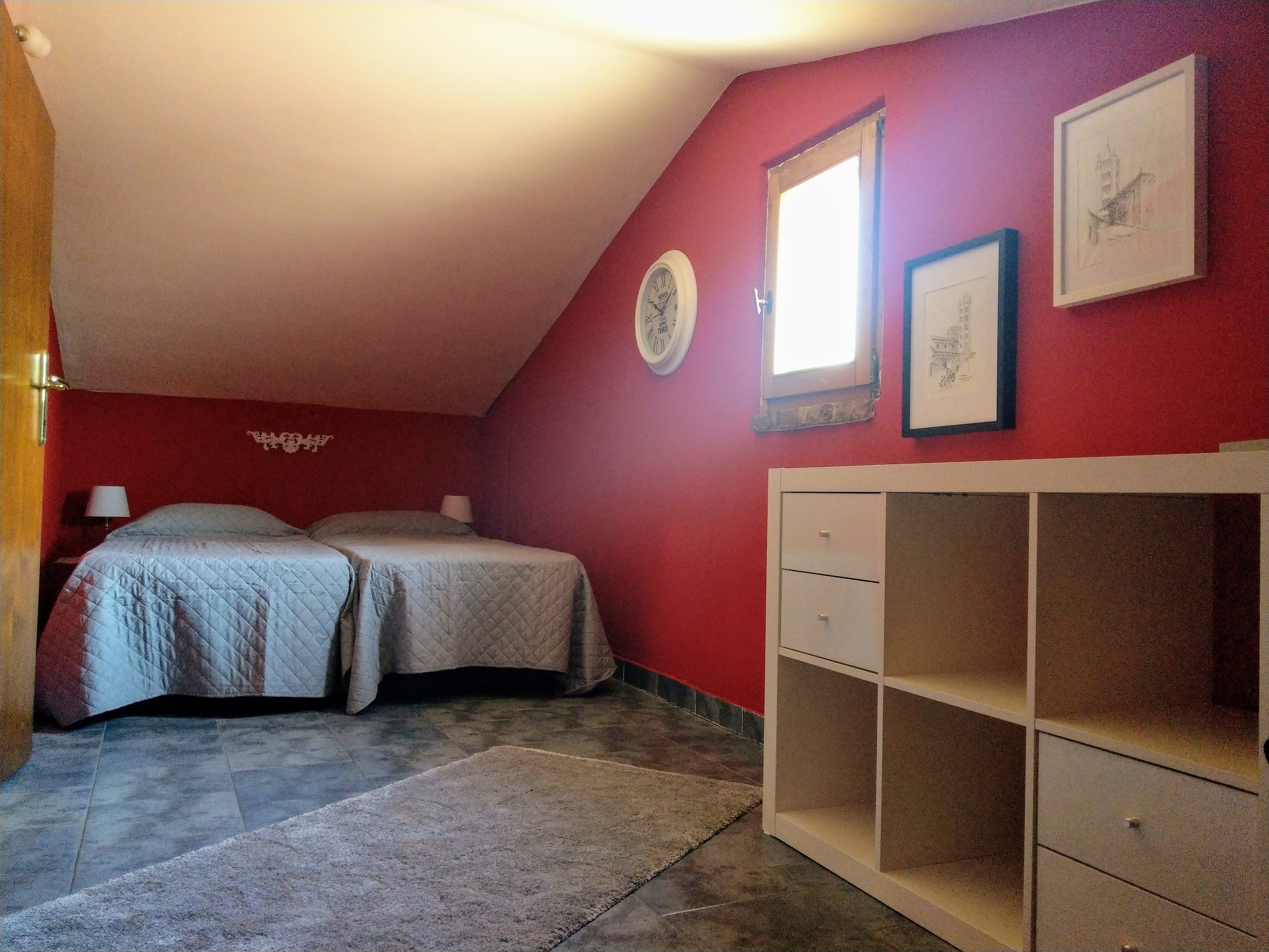 Der erste Stock, den ihr über eine Wendeltreppe erreicht, hat ebenfalls ein Bad mit Dusche. In zwei getrennten Räumen befinden sich jeweils zwei Betten. Der Raum mit den längs aneinander liegenden Betten ist ein Durchgangszimmer.